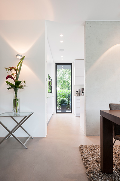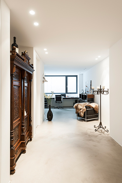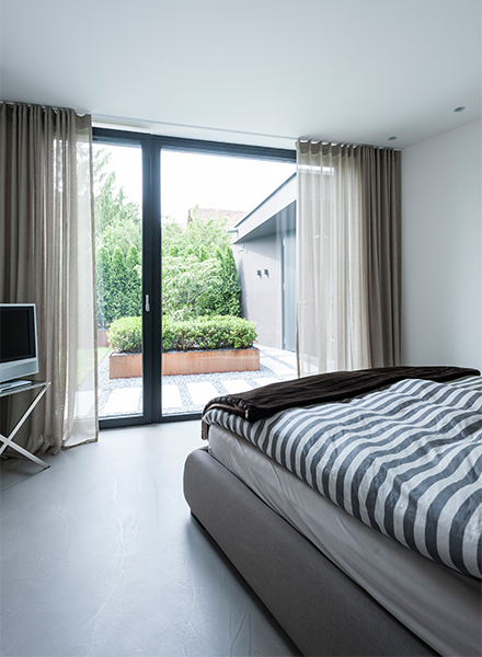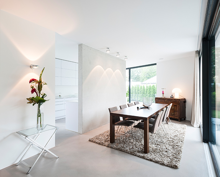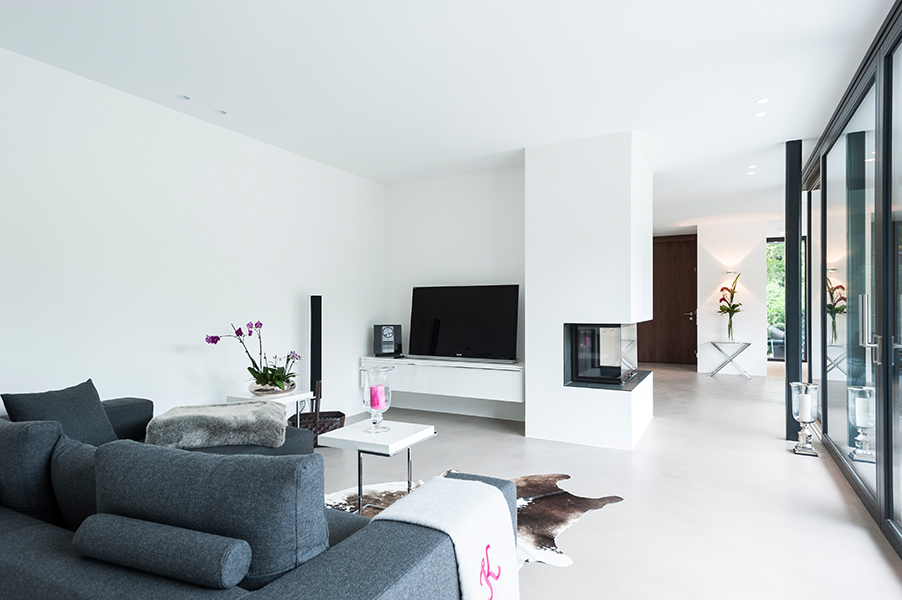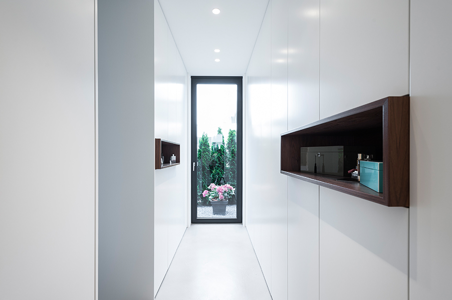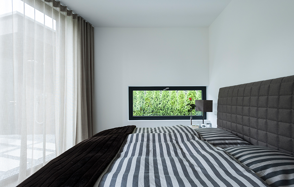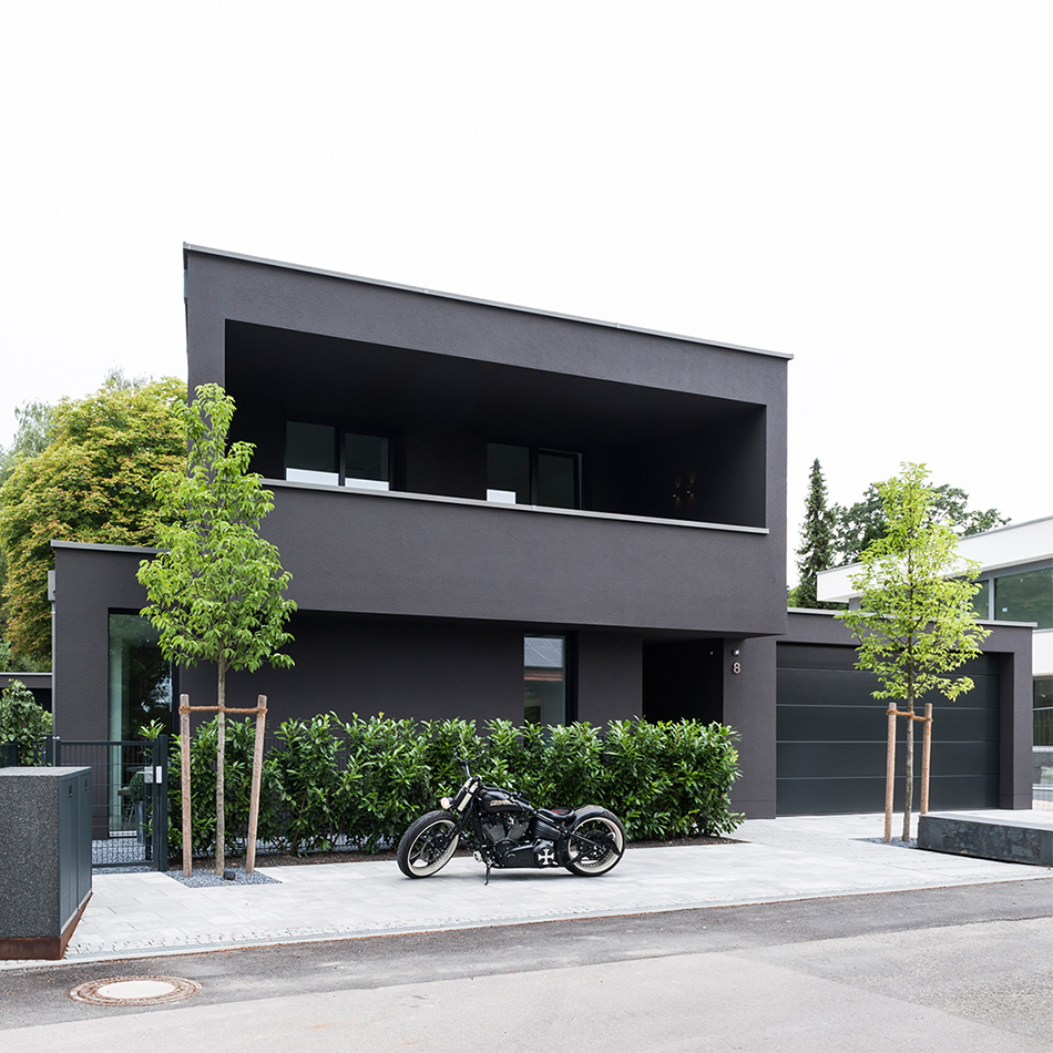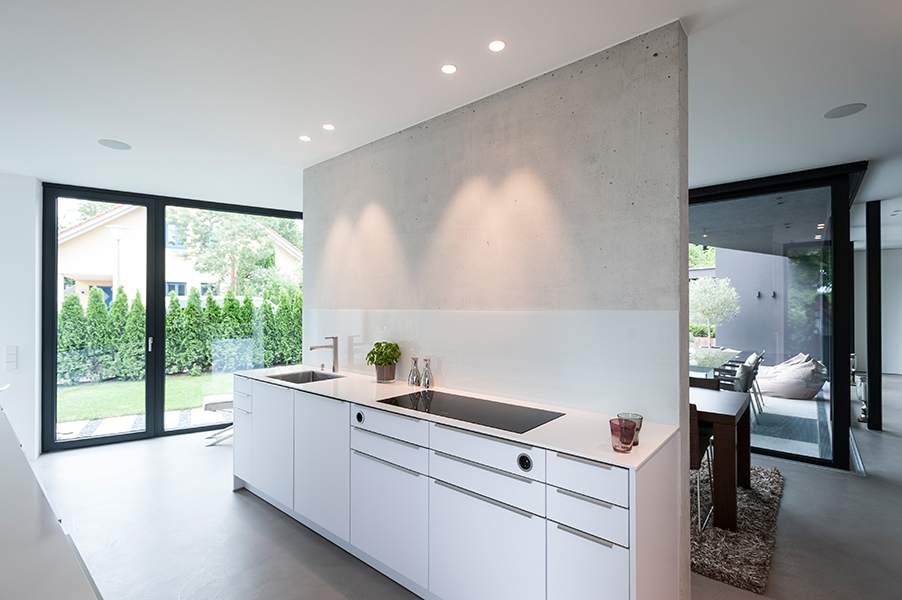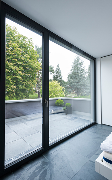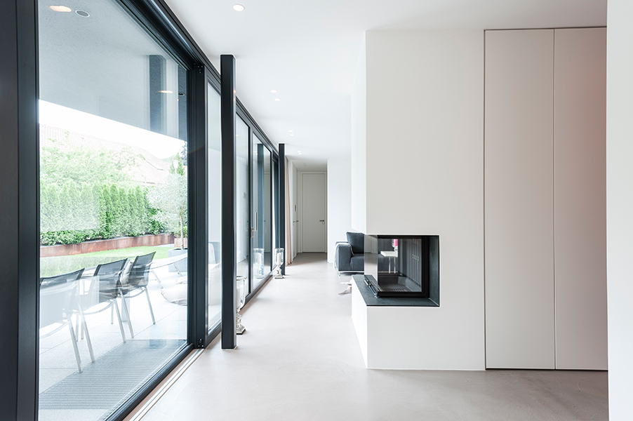Ein Architekt hat meist seine unverkennbar eigene Handschrift. Diese ist auch bei diesem Neubau deutlich zu erkennen. Hier wurde mit Fenstern aus Merantiholz geplant, die dunkel lackiert sind. Auffälliges Designmerkmal ist die Fenstergröße. In der Folge mussten Scheiben mit über 500 kg Gewicht eingesetzt werden. Auch im Innenraum wurde nichts dem Zufall überlassen. Raumhohe Schiebetür-Eckelemente auf Gehrung sind nach tragenden Innensäulen ausgerichtet, so dass die Säulen mit der Fensteraufteilung übereinstimmen. Und auch die Haustüre ist ein echtes Unikat, gefertigt aus französischem Nussbaumholz und stumpf einschlagend.